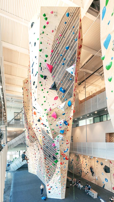 The bright, white space is warmed by wood climbing walls, sculptural furniture installations, and other wood accents on floors and ceilings. The intention was to use common materials in a reimagined, artful way. Sprinkled atop an otherwise restrained palette, playfulness abounds with candy-colored climbing holds, bright furniture, and humans who bring life and movement.