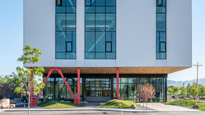 The architecture of The Front at South Main is defined by a rigorous steel structure shrouded in a thin shell. The climbing walls rise through the three-story central opening of the building, acting as free-standing sculptural objects in the center of the space. They are surrounded by multiple levels of open walkways that look out onto the floors below while simultaneously framing expansive views of the Wasatch and Oquirrh mountains.