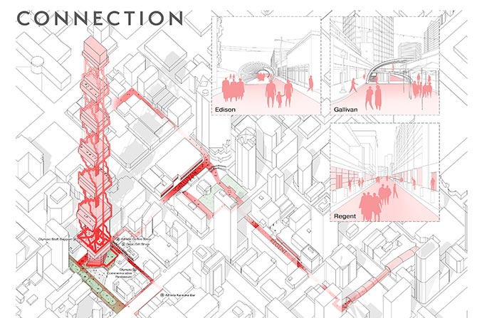 Located on Edison Street, a culturally and historically rich midblock, the tower activates and creates a micro-climate within the car-centric streets of downtown Salt Lake City. Altius Tower acts as a gate, drawing the public from the large macro-scale blocks to a micro-scale community experience filled with diversity and rich history.